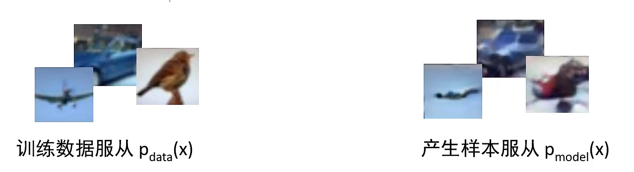 生成模型:给定训练集,产生与训练集同分布的新样本。即如下图所示希望学到一个模型pmodel(x)p_{model}(x),其训练样本的分布pdata(x)p_{data}(x)相近。假设我们给定了一万张二次元头像的图片,通过对这一万张图片学习之后得到的模型知道如何这些图片是如何产生的,并且可以生成出与新的二次元图片,并与原来的图片是同一类的(即同分布)。但我们的原来的图片的特征空间的分布我们是不知道的,我们的目标就是寻找一个与其同概率密度函数的模型,从该模型从去采样得到的样本就是我们想要生成的图片。