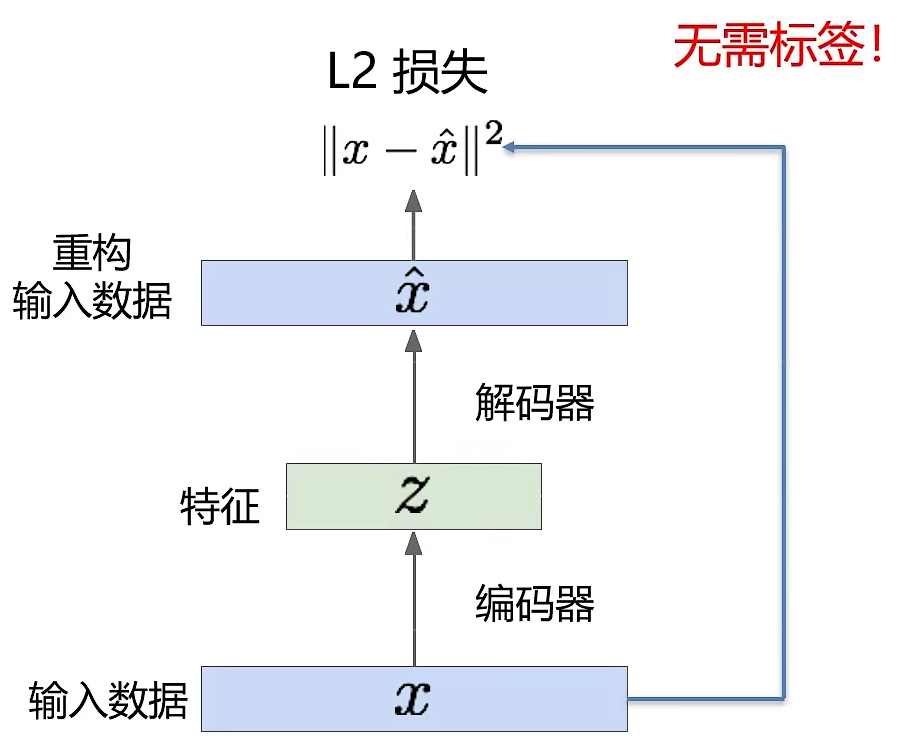 我们通过编码器来获得输入x的主要特征,由于没有正确的z,所以仅有编码器是无法对模型进行训练的,所以这时候就需要解码器,解码器通过编码z来生成一个新的x,我们希望这个x与我们的输入x越接近越来,由此得到了我们的代价函数(xx^)2(x-\hat{x})^{2}.