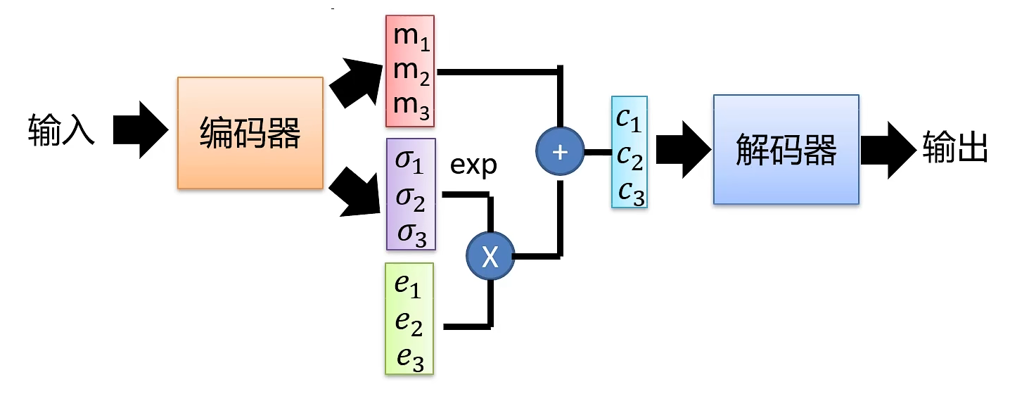 变自分编码器的结构如图所示,其主要思想是先通过输入x学习到一个分布,再在x的的分布中采样出一个z到解码器中来生成数据。其中m是x的分布的均值,σ\sigma是x的分布的标准差,(m和σ均通过全连接层学习得到\sigma均通过全连接层学习得到)e是采样的倍率。ci=exp(σi)ei+mic_{i}=exp(\sigma_{i})*e_{i}+m_{i}.该式子是说VAE并不是像自编码器那样直接将编码器提取出来的特征编码直接输入到解码器中,而是再给他加上一个噪声(即exp(σi)eiexp(\sigma_{i})*e_{i}),来采样出一个新的特征编码。