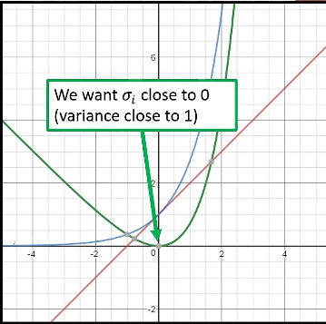 那么我们的代价函数是如何呢?如果我们像自编码器那样,只通过(xx^)2(x-\hat{x})^{2}来评估模型的话,那么我们的网络中的σ\sigma就不会进行训练(全部学成了0),我们的网络就变成了自编码器。所以我们就需要另外一个代价函数i=1(exp(σi)(1+σi)+mi2)\sum_{i=1}(exp(\sigma_{i})-(1+\sigma_{i})+m_{i}^{2}),其中exp(σi)(1+σi)exp(\sigma_{i})-(1+\sigma_{i})的图像如下图绿色曲线所示,我们希望这个式子最小,那么此时σ\sigma就越接近与0,exp(σ)exp(\sigma)就越接近与1,即希望我们的特征编码符合正态分布。m2m^{2}则是L2正则化,我们希望我们取出来的z能够分散开来。