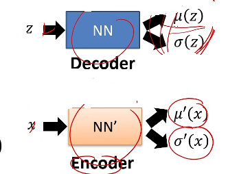 我们已知P(z)是正态分布,x|z 符合N(u(z),σ(z))N(u(z),\sigma(z)),其中u(z),σ(z)\sigma(z)为带估计的参数。由于我们的z是一个隐含量,所以我们并不能直接的求出最大化的L。所以我们需要另一个分布q(z|x),其中zx N(u,(x),σ,(x))z|x~N(u^{,}(x),\sigma^{,}(x)),(同样用神经网络来学习)