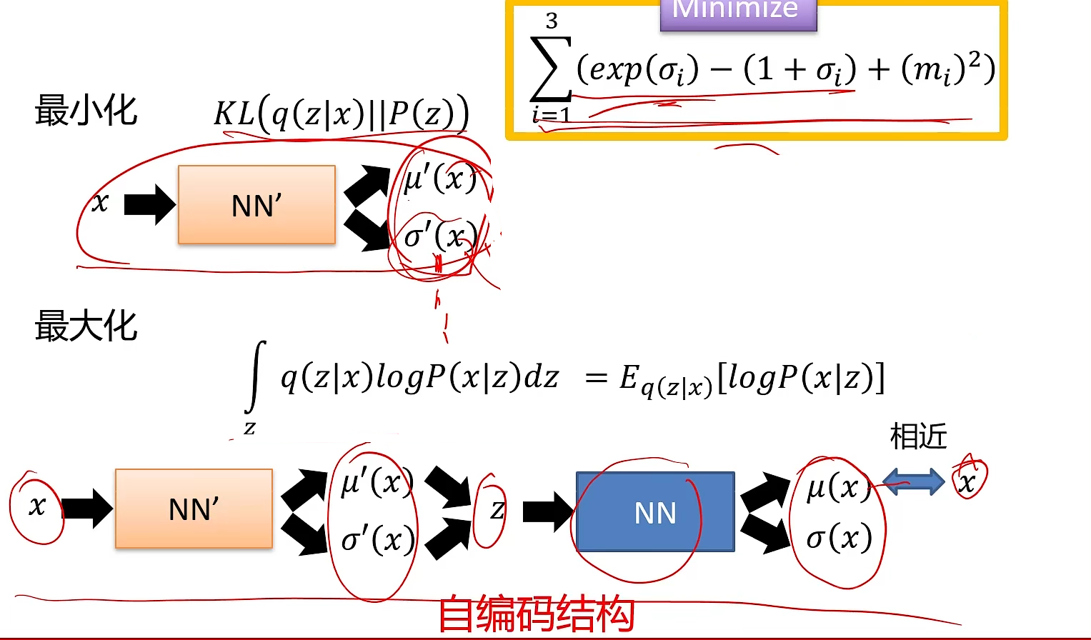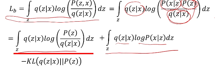 我们来看最终结果的前一部分,它是一个负的KL散度,要想使我们的L最大,那么该KL散度应该越小,即趋于0,而我们的P(z)是一个正态分布,那么q(z|x)也应该服从于正太分布(解释了前面第二个代价函数最小化σ\sigma为什么要趋于0)对应了我们的第二个代价函数.第二部分是我们给定一个x产生一个z,并利用这个z再生成一个x^\hat{x},此时其概率越大,那么就说明此时x^\hat{x}与x就越像,那么就对应了(xx^)2(x-\hat{x})^{2}应越小越好。