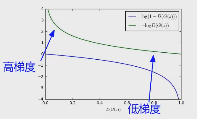 但是在训练生成器的时候,直接优化这个目标函数并不是很有效。应为log(1Dθd(Gθg(z)))log(1-D_{\theta_{d}}(G_{\theta_{g}}(z)))的函数图像如下图所示,当生成器生成的样本效果很差时,判别器输出值会很小,此时生成器的损失函数在此处得到的梯度会很小,使得生成器学习的非常慢。相反,当生成器生成的样本较好时,判别器输出值会较大,此时生成器的损失函数在此处得到的梯度又会很大,生成器更新较快。